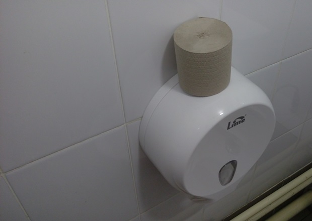 В туалете обнаружила треснувший умывальник и дешевенький, не подходящий установленному держателю, рулон серой туалетной бумаги.