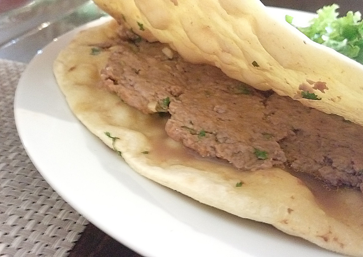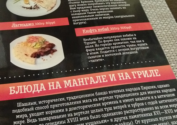 «Свернуть пополам, чтобы получился конвертик, а то весь сок вытечет», — учила нас есть блюдо официант. Тщетно — мясной сок нельзя было удержать, его было очень-очень много. Хорошо чувствовался и нежный мягкий фарш, который обнимала плотная эластичная лепешка, слегка поджаренная с двух сторон. Очень вкусно, сытно и поразительно недорого.