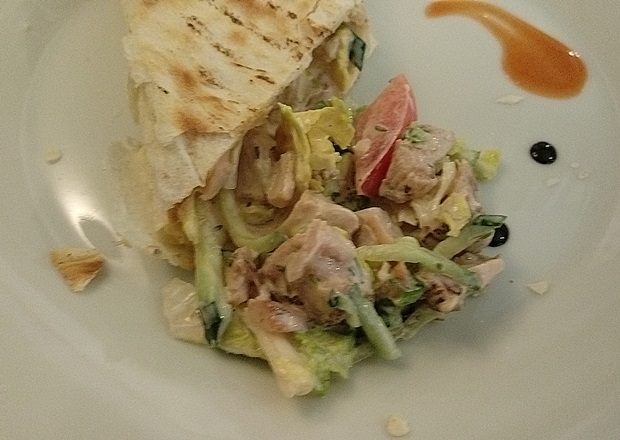 Тонкий лаваш поджарили до хрустящей корочки, и он хорошо поддерживал сочную, пропитанную соусом начинку. Кстати, соус был скорее сметанный, чем майонезный — легкий и ласковый, как мама. Немного свежих огурчиков соломкой, крупные кусочки томатов и салатные листья сопровождали вкуснейший, с мангальным дымком, куриный шашлык. Да, показалось, что не хватало ингредиентов, может, хотелось бы больше пряностей, но это если придираться. Мясо и хрустящее тесто лаваша «делали» это блюдо.