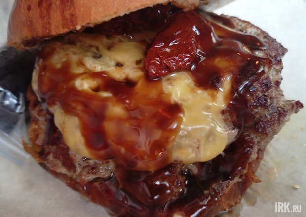 Вот мои впечатления от свежего горячего бургера. Нет, он отнюдь не лучший в городе. Описывая те, что поехали в IRK.ru, я почти не буду говорить о пышности булки и внешнем виде, потому что, сами понимаете, даже если перевозить их осторожно, при минимальной потере времени (переезд с места на место занял 7 минут), бургер пропитывается соком и деформируется. Но остальные компоненты: соус, овощи и их сочетание с мясом — вполне себе можно обсудить. Фарш тоже был везде примерно одинаковый. Где-то больше жилок, где-то — меньше.