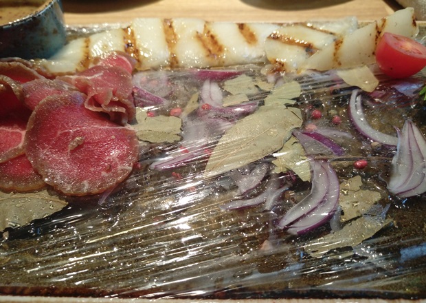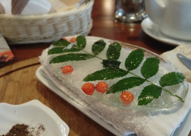 Нет, мне принесли кусочки фактически сырой мороженой вырезки. И дыню, слегка поджаренную на гриле. А «ледяную подушку» — активно тающие льдинки на тарелке с луком, лавровыми листами и горошинами перца — обмотали пищевой пленкой, что выглядело просто нелепо. Для сравнения покажу фото ледяной подушки из другого ресторана, в котором была недавно.