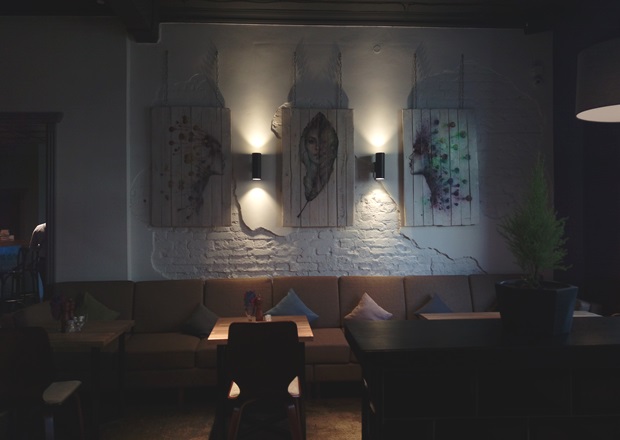 Проработкой интерьера и меню занимался один человек — некий Антон, представитель той самой компании. С интерьером вышло неплохо, от уникальности я, конечно, в обморок не упала. Но признаю: во всех трех залах замечены детали, чувствуется, что обстановку хорошо продумывали — в небольших помещениях уютно, свежо и симпатично. Только напротив четырех мрачных портретов одного и того же унылого мужчины с прикрытым веком усаживаться не хотелось (благо я могла выбирать — все три зала были пусты).