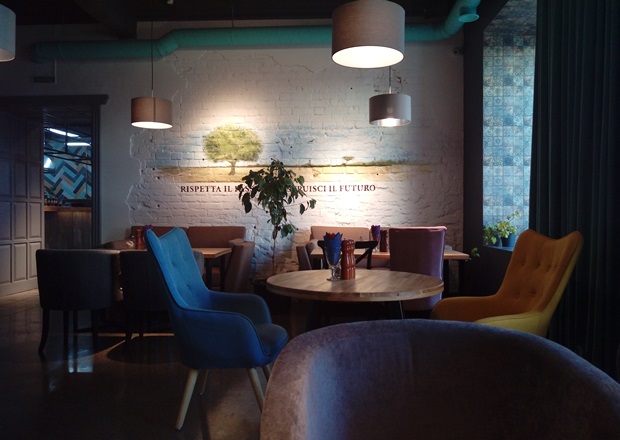 В передней меня встретила девушка-официант, она могла и не говорить, что стажер, это было видно невооруженным взглядом: растрепанная, неуверенная, вешалки роняла… но! Очень при этом была старательная, вежливая, улыбалась, приняла заказ, подала кофе и вдруг… Попрощалась со мной, мол, смена закончилась. Мой столик подхватил более опытный с виду сотрудник — Станислав. Он был разговорчив, быстро восполнил пробелы в моих знаниях: «Олио» — средиземноморский ресторан, но большая часть меню состоит из итальянских блюд, которые готовят с использованием продуктов компании «Донна София» (оливковое масло, соусы, каперсы, артишоки). Собственно, для того, чтобы продвигать эту продукцию, и создавалось заведение. И такое бывает, да.