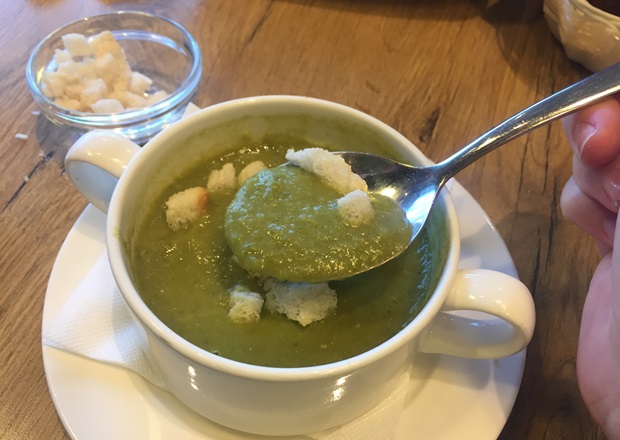Зеленая жижа в тарелке не показалась мне привлекательной. Высыпала в нее сухарики, которые подали в дополнение. Они несколько скрасили картину, и я рискнула — отправила ложку с супом себе в рот.