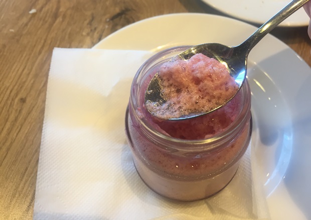 Когда принесли десерт, сразу отметила интересную подачу. Очень милая маленькая емкость, которая на вид казалась совсем игрушечной. Но где же мусс?