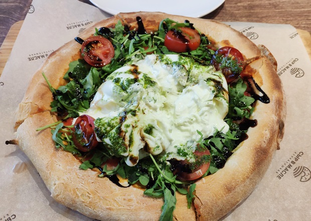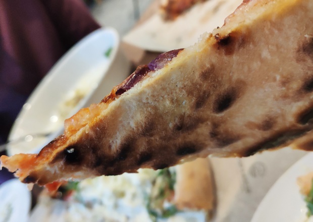 Когда шла в бурратошную, думала, что с ума сойду от восторга, попробовав это блюдо. Ну, красиво выглядит, правда же? Увы, ожидания не совпали с реальностью. Тесто слишком тонкое и слишком поджаристое, я такое пробовала впервые. Бывает воздушное, пышное, бывает эластичное, тягучее. А здесь — твердое, пористое и местами сухое, ломкое.