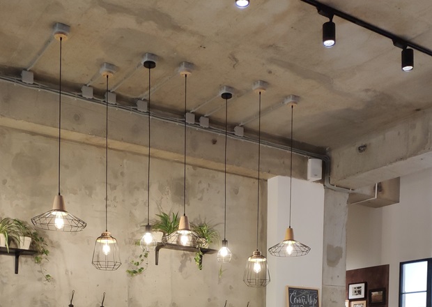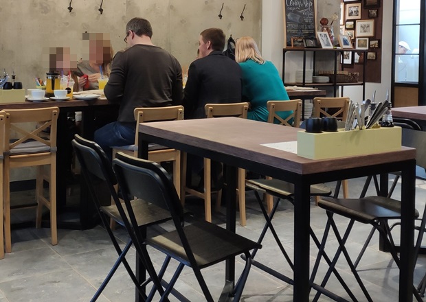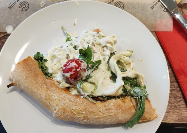 Но я вас немного помариную и по традиции расскажу об атмосфере. Уже на входе в небольшое помещение у меня слегка закружилась голова от чудесного запаха выпечки, жареного сыра и базилика. Аромат, который вызывает аппетит — это уже ползачета за атмосферу кафе, согласитесь? Обстановка в зале простенькая, но уютная: высокие столы, стулья, немного цветов в горшочках да свисающие светильники. Есть один длинный стол для больших компаний.