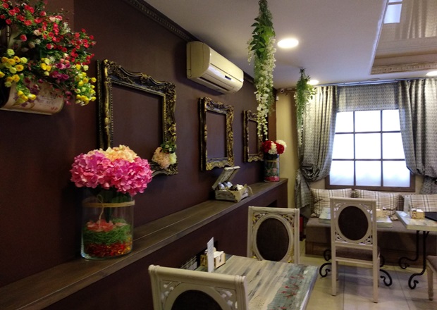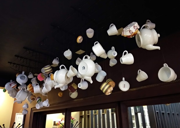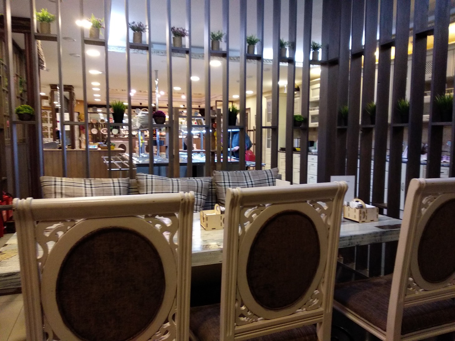 Зашла и обомлела! Замысловатый интерьер с необычной планировкой: что-то среднее между выставочным павильоном элитного салона кухни, цветочной лавкой и кафе. Возможно, это немного перебор, но такой симпатичный! Чувствуешь себя Алисой на чаепитии у Безумного Шляпника.