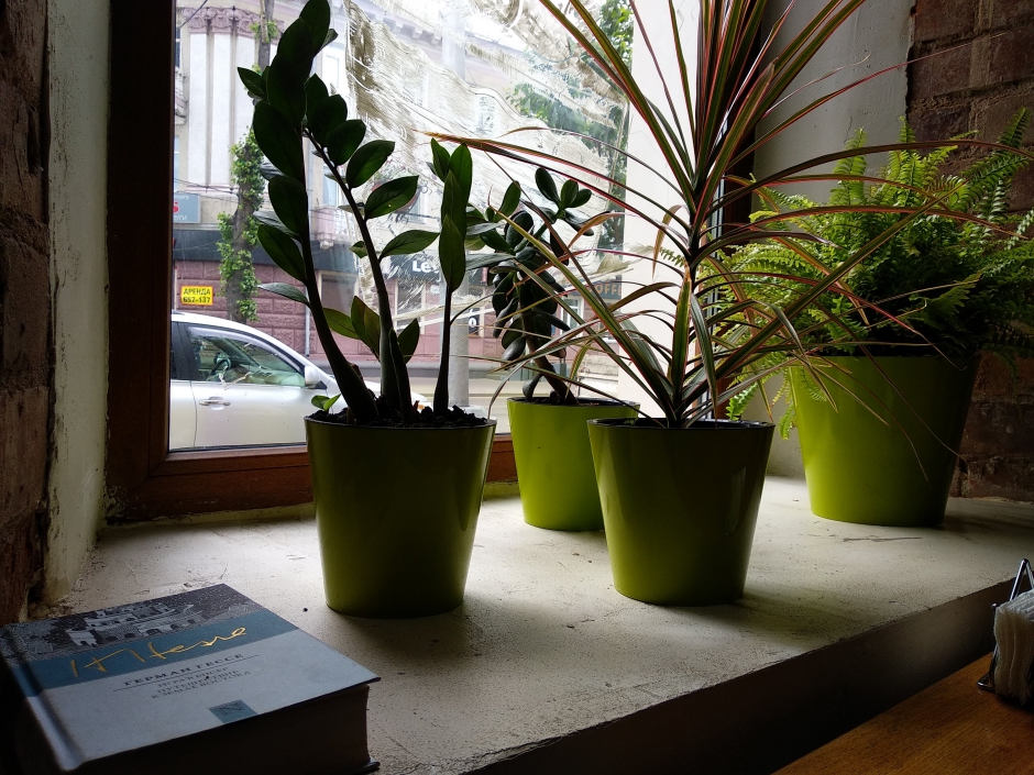 В целом, обстановка мне понравилось: лофт, высокие потолки, деревянные столы, простые светильники, зелень и книги на подоконниках. Несмотря на простоту, здесь было уютно.