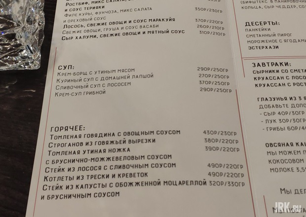 Меню разработано, по словам владельцев, так, «чтобы и мясоед, и вегетарианец нашёл для себя свое блюдо». Ну допустим. Мне лично понравилось, что перечень блюд не тоскливый, видна какая-то фантазия: есть крем-борщ, бруснично-можжевеловый соус, котлеты из трески и креветок — интересно.
