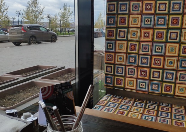 Помните, помещение «Сороки» показалось мне крайне скучным, блеклым? Сейчас стало чуть веселее: стены покрасили, добавили больше ярких деталей, страшные шторы-висюльки убрали. Появилось много полок из дерева, а на них — куча незапоминающихся скляночек, картинок, цветных леек. Все это вроде бы ни о чем не сообщает, но пространство заполняет. Несколько удручает вид пустой витрины на входе, но в целом вполне сносный интерьер.