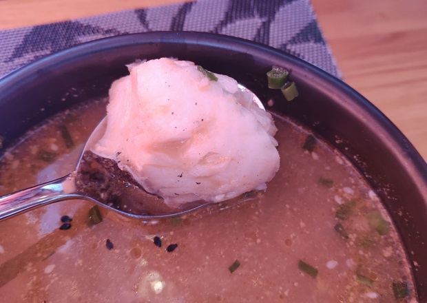 А, ну это, товарищи, рыбный суп. Снова почти не заметила специи, зато ощущались резиновые морепродукты и кости от разваренного в непотребный вид скользкого палтуса. Снова поставила себя на место человека, который никогда корейские блюда не ел (это было не сложно, ведь я совсем недавно познакомилась с этой кухней). И если бы я впервые пробовала хемультан и вообще все выбранные блюда в таком варианте, я бы подумала, что кухня Кореи — абсолютно не мое.