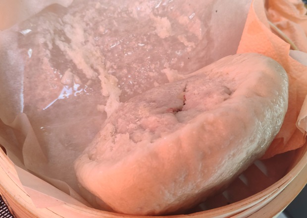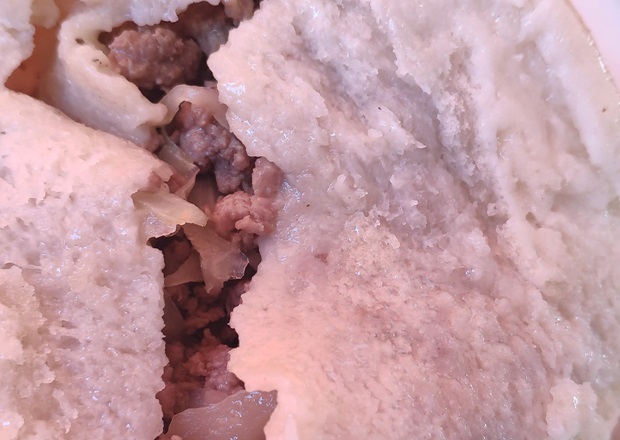 Пирожок на пару с мясом и капустой. Все бы ничего, если бы изделие не развалилось прямо у меня в руках: тесто снизу прилипло ко дну коробочки, размокло и порвалось. Я попробовала отрывать кусочки теста и собирать ими весьма недурной, кстати, фарш: нежирный, нежный, с приятным капустным привкусом. Была голодной, поэтому какое-то время меня даже не смущала вся нелепость ситуации. Но я быстро устала.