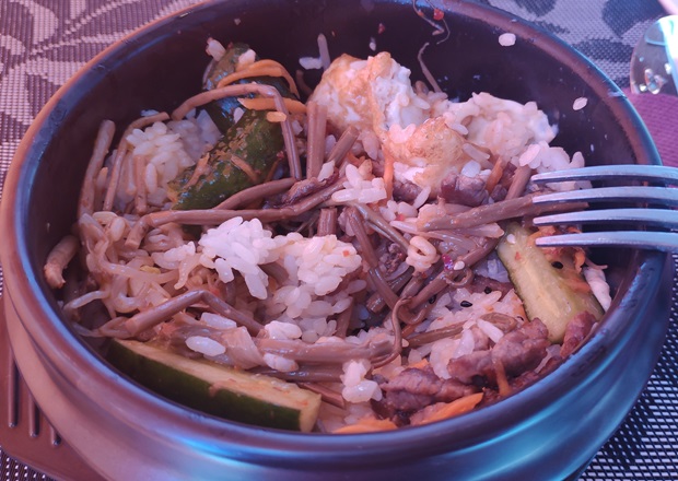 Главная претензия к блюду — это холодный, грузной массой лежащий на дне миски рис. Его будто еще вчера уложили в посудину и поставили в холодильник, а когда я заказала бибим паб (трудности транслитерации, чаще это блюдо называют «пибим паб»), достали миску и накидали поверх риса говядину, огурцы, папоротник и яйцо. Получилось очень сухо, говядину пережарили, крайне не хватало соуса и остроты, продукты в ансамбль не складывались. Жаль папоротник, он был единственным хорошим ингредиентом в этом безумии.