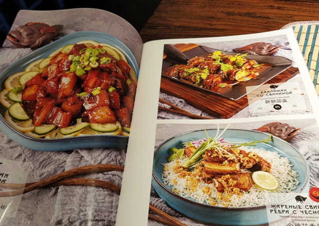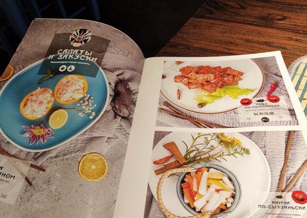 Эпизод второй. Отправляемся за столик, усаживаемся и ждем меню. Пять минут – никого нет. Мимо проносится официантка: «Как, вам не принесли меню?!». И вот оно у меня в руках. Оформлено как глянцевый журнал, и, естественно, бумага, пусть и мелованная, уже в пятнах. Огромные красивые фото и о-о-очень мелкие цены. Набор блюд в целом традиционный для китайского ресторана, только отметила для себя сёмгу с апельсином и два блюда с корнем лотоса – в салате и на сковороде.