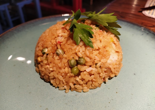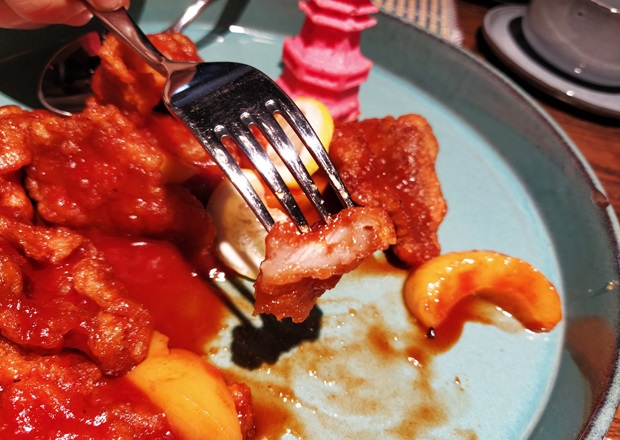Скорость подачи, конечно, удивительная. Но, увы, блюдо не готовили специально для нас, а просто разогрели. Крахмальный кляр по краям кусочков я не смогла разжевать: он был супертвердый. Блюдо было сухим, соус не спасал. Самой свинины в недрах кисло-сладкой оболочки непростительно мало. И как вишенка на торте – зачем-то в тарелку накидали консервированных персиков, что, на мой взгляд, перебор: блюдо и так подразумевает сладкий соус. Три балла с натяжкой.