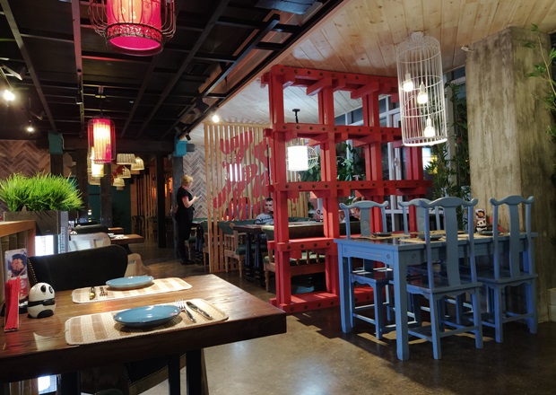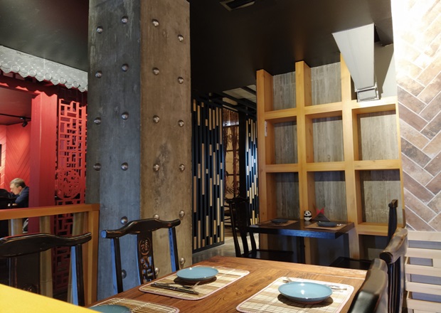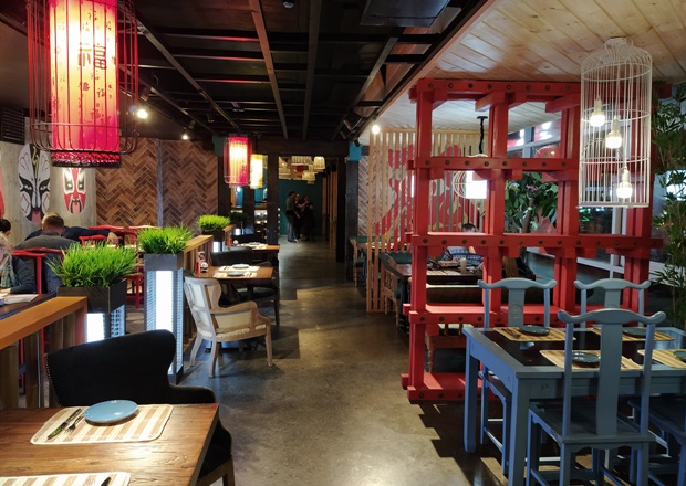 Мы со спутником заняли столик на двоих посередине зала с просторными креслами, и мимо нас постоянно курсировали сотрудники заведения: то бармен с ящиком стаканов, то мойщица в резиновых перчатках, то вальяжный повар-китаец в большом колпаке, то стаи официанток (они почему-то практически не ходили по одной, а по двое-трое). Я ни в одном ресторане еще не видела столько персонала за один раз. Во многом это происходило потому, что кухня и бар расположились в абсолютно разных концах заведения, и при организации пространства, очевидно, над этим не заморачивались.