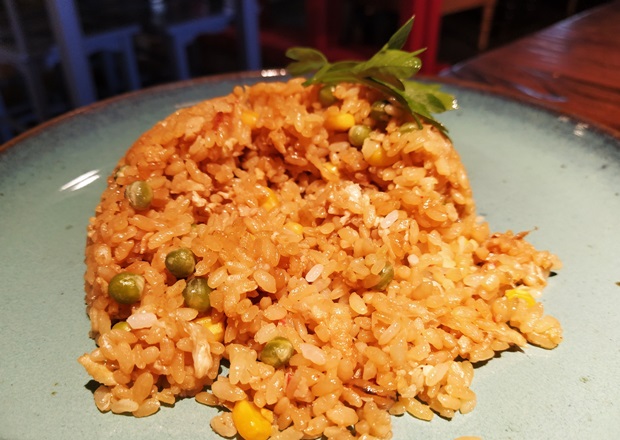 В отношении этого блюда чувствовался какой-то подвох. Мне кажется, создатели опустили словосочетание «с ароматом», когда составляли меню. «Рис с ароматом морепродуктов» — вот это было бы больше похоже на правду. Ни одной, даже самой маленькой щупальцы осьминожка, ни одного ошметка кальмара или внятного кусочка крабовой палочки. Мой спутник нашел микроскопическую креветку и тут же ее съел, видимо, радостно разволновавшись из-за ценной находки. Три балла. А, чуть не забыла: сам рис нормальный. Рис как рис. Разве что суховат после разогрева.