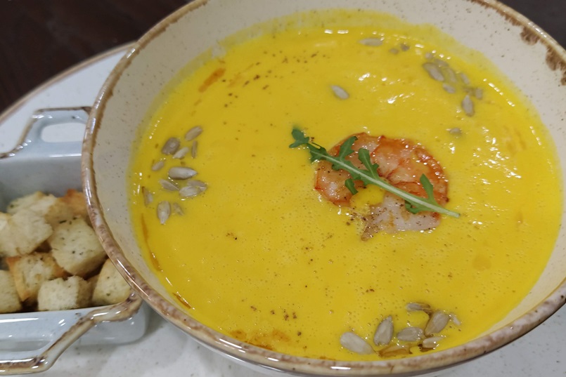 Тыквенный крем-суп с креветками и семенами подсолнечника, 250 рублей