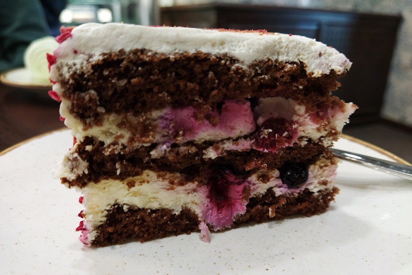 Ну, в качестве десертов от «Кейк хоум» сомневаться мне еще не доводилось. И в этот раз кондитерская не подвела. Прекрасный воздушный бисквит с солоновато-сладким крем-чизом и целыми ягодами: смородиной, малиной и, кажется, черникой. Невозможно остановиться!