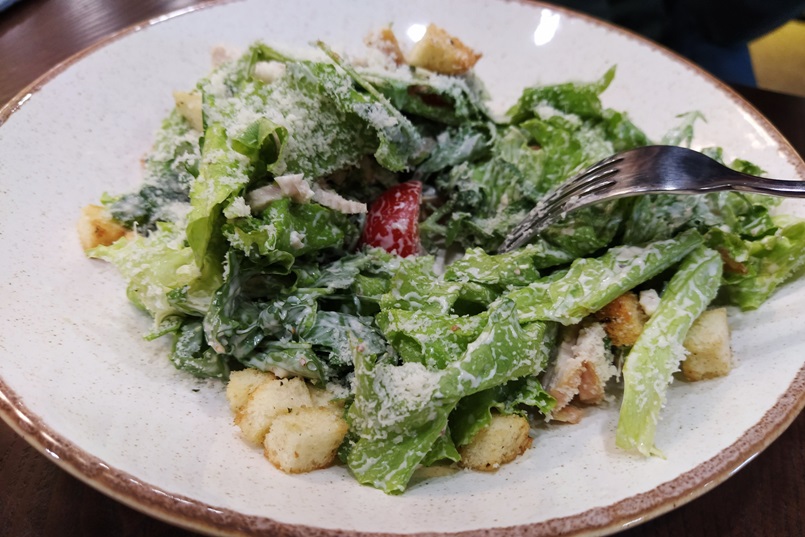 Прождав полчаса, я наконец увидела то, за чем приходила — полноценные блюда от «Кейк хоума». Салат «Цезарь» на вид мне понравился: подкупил солидный объем порции и обилие разного вида зелени (в салате был не только «Айсберг», но и руккола). Весьма недурным блюдо оказалось и на вкус.