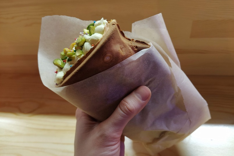 Сверток мало того, что божественно пах, он был таким увесистым, что тянул на полноценное блюдо. И на вкус десерт оказался прекрасным: заварной крем сделан будто по бабушкиному рецепту, фисташковый крем – в меру сладкий и жирный. О только что испеченной вафле и вовсе молчу!