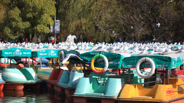 Куньминю достался всего лишь денек. Мы готовились к выезду из Китая, и поэтому этот единственный день был посвящен делам бытовым и прогулке. Маршрут проходил через городской парк с зеленым озером. В это время там оказались чайки. Целая колония чаек! Они осадили сам пруд и прибрежные территории.