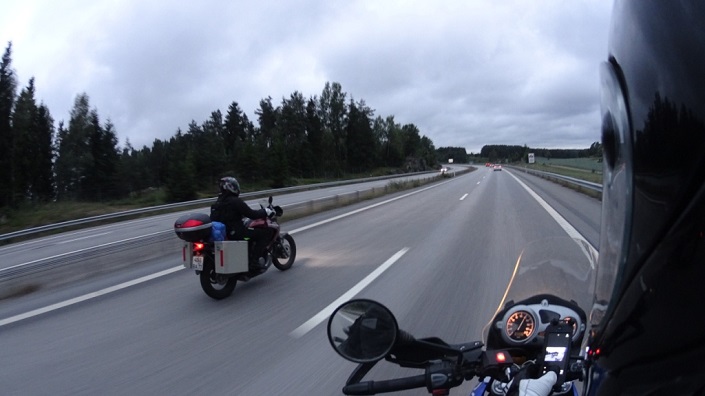 После Санкт-Петербурга прямиком отправились на российско-финскую границу. Мотоциклистов там пропускают без очереди, мы и проехали между машин и встали самыми первыми, поэтому все формальности у нас заняли минут 20. Хорошо, что на границе попросили только заграничный паспорт и ПТС на мотоцикл. Выехав с таможенного пункта мы вздохнули с облегчением, ведь теперь мы 100% поедем вокруг Европы! «Ехуууу!» — кричали мы друг другу по рации.