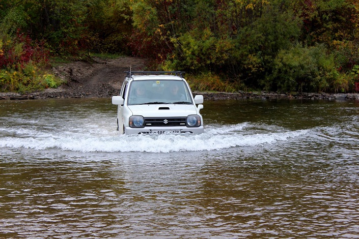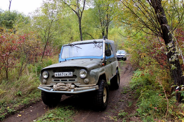В пещере Охотничьей мы побывали 19 сентября. Для этого мероприятия вполне хватает одного дня. Попутно заехали в питомник маламутов в поселке Малое Голоустное на экскурсию, посмотрели собачек и попили чай с брусникой. По трассе доехали почти до Большого Голоустного, в 8 километрах до него свернули на лесную дорогу и пересекли вброд реку Голоустную. Дорога вполне проезжая, но не для седанов. Ехали двумя машинами: хороший УАЗ и стандартный Suzuki Jimny.