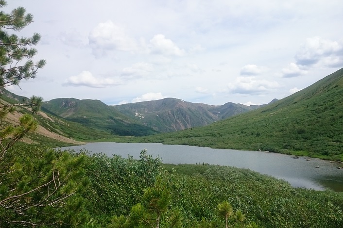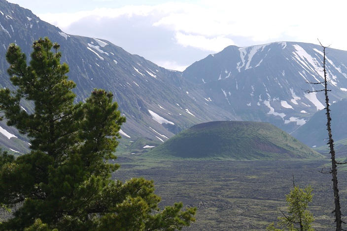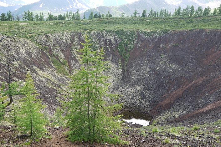 В обед встали с лагерем на традиционном месте под Перетолчиным. В тот же день наша молодежная туристическая команда сбегала на дальний вулкан — Кропоткин, а мы сходили на Перетолчин, натаскали дров и сделали ужин. Озеро внутри вулкана оказалось мелким — покупаться не удалось.