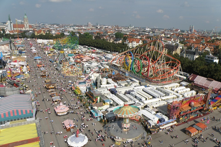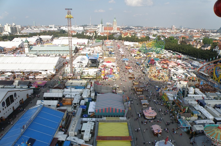 Выходим на улицу, тут уже тепло и солнечно, подходим к служебному входу, один за одним въезжают грузовики. Идем к входу для посетителей, вход бесплатный, у нас проверяют сумки, а вот рюкзак за плечами даже не заметили. Проходим, площадь огромная, много аттракционов, развлечений, и, самое главное, больше 30 крытых павильонов, в каждом из них представляют напитки, около каждого телеги с бочками, а в упряжи красавцы-тяжеловозы. Каждый павильон старается в оформлении перещеголять другой, что творится внутри — не передать словами, свободных мест нет, бронировать столы нужно было за несколько месяцев до мероприятия! Тысячи мужчин и женщин в национальных костюмах, девушки в платьях и корсетах с кокетливыми передниками, мужчины в кожаных шортах, гетрах, национальных шляпах, в центре поют национальные баварские песни, кое-кто уже танцует на столах. К вечеру танцевать на столах будут все!