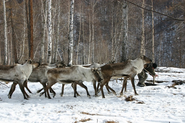 На следующий день мы поехали еще километров 15 выше поселка на стойбище оленей. Наступала весна, поэтому тофы начинали перегонять свои стада выше в горы на зимние пастбища. Мы довезли на своих машинах двоих охотников с поклажей и собаками. Они поймали своих оленей и приготовились к долгому переходу. Мы фотографировались с животными, гладили их. Дети катались. Какие всё же олени спокойные и красивые. Нас совсем не боялись, как кошки, которым нравится, когда их гладят. Раньше думал, что они боязливы, как коровы, но не тут-то было — совсем спокойные.