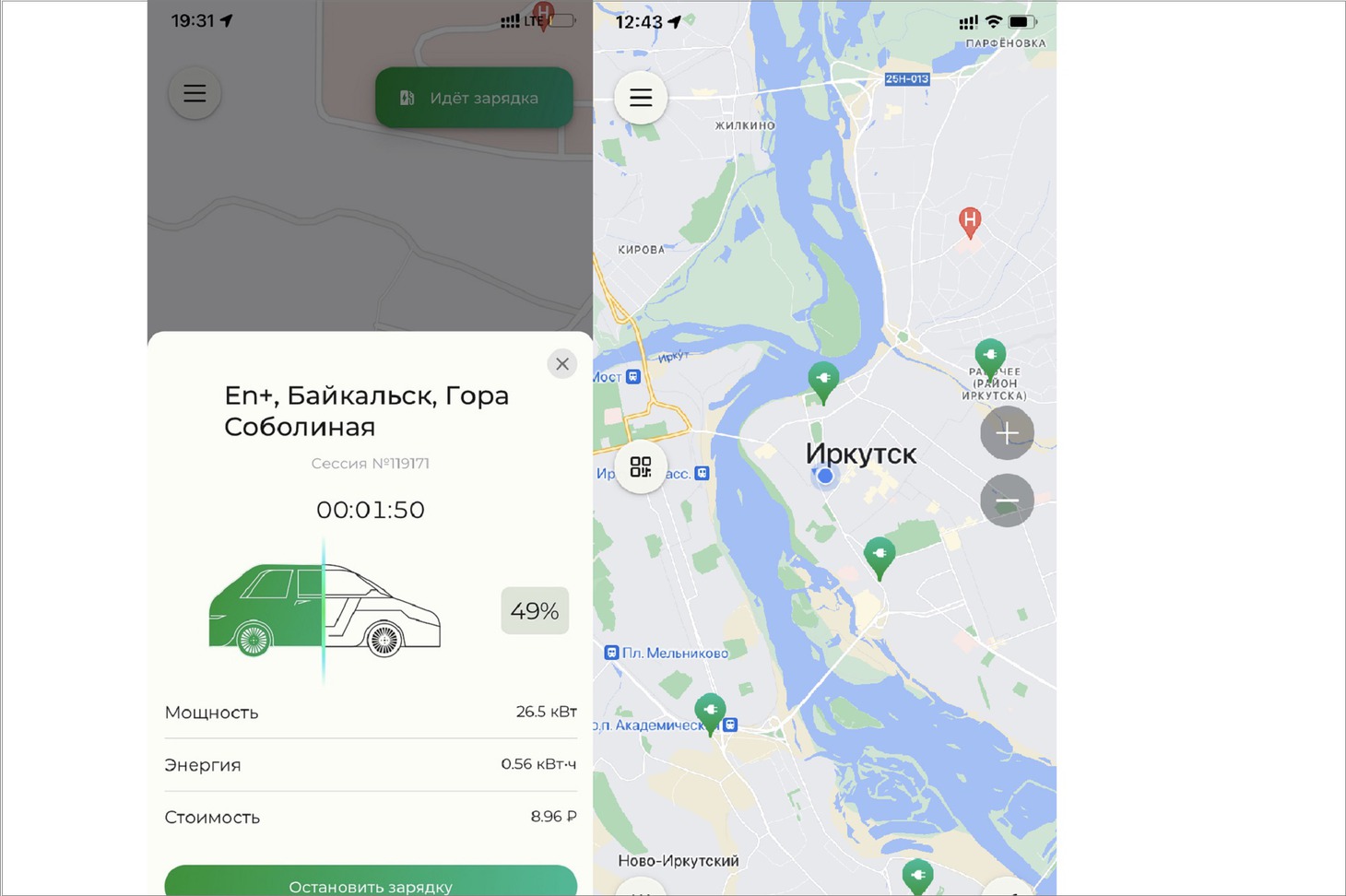 Поужинала в небольшом ресторане рядом с отелем и решила не откладывать в долгий ящик главную задачу — зарядку электромобиля. Станция от Эн+ установлена рядом с отелем «Гранд Байкал», под фуникулером. Я заранее установила на телефон приложение EV-Time (для Android, для Apple). Туда необходимо ввести номер банковской карты, с которой будет сниматься оплата за заправку. За сохранность личных данных можете не переживать — мобильное приложение абсолютно безопасно. В EV-Time загружена интерактивная карта с расположением всех близлежащих ЭЗС в регионе. Находите нужную и подключаетесь.