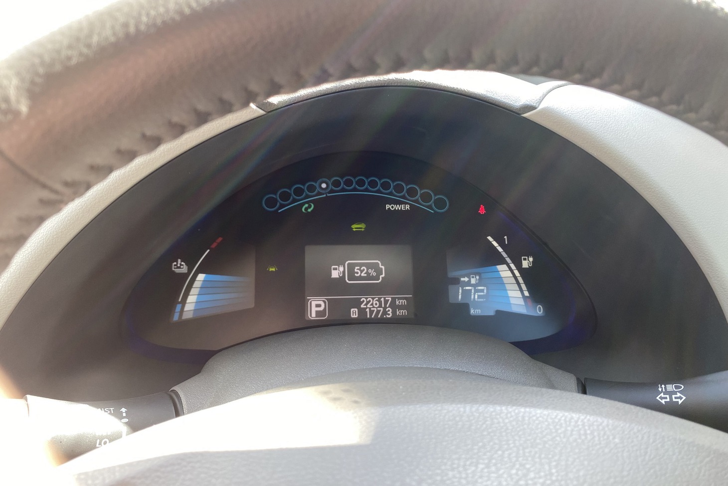 Я рискнула и выбрала совсем не экорежим. Но, видимо, Leaf был доволен моим стилем езды, потому что на приборной панели начали… расти «елочки». Сначала было непонятно, что это за елки и почему они растут и их становится больше. Как выяснилось, количество деревьев является «Индикатором ECO» — экологичного вождения. Даже охватил азарт — смогу ли я набрать все четыре. Добралась только до трех.
