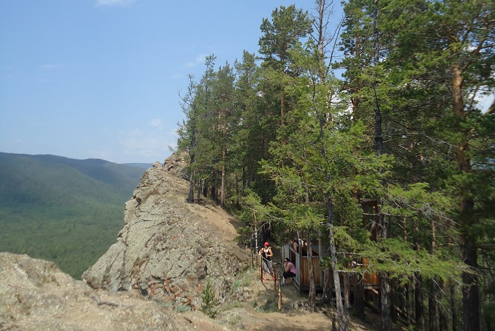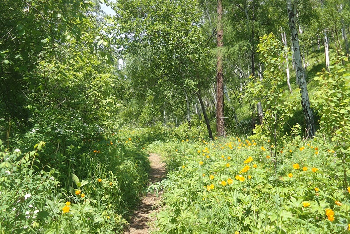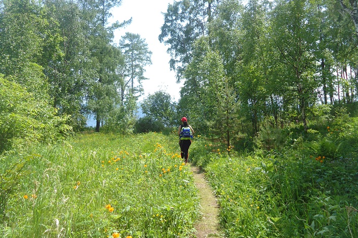 Первые 4—5 километров самые сложные: улица Гудина идет в гору и никак не хочет кончаться, а после нее начинается довольно энергоемкий подъем на высоту почти 400 метров над уровнем Байкала. Под весом рюкзака сложно восстанавливать дыхание, и долгое время я шла последней. В красках представляла, как люди на этом участке сдаются, поворачивают обратно и, отмахиваясь от оводов, возвращаются в Листвянку гулять и есть омуль.