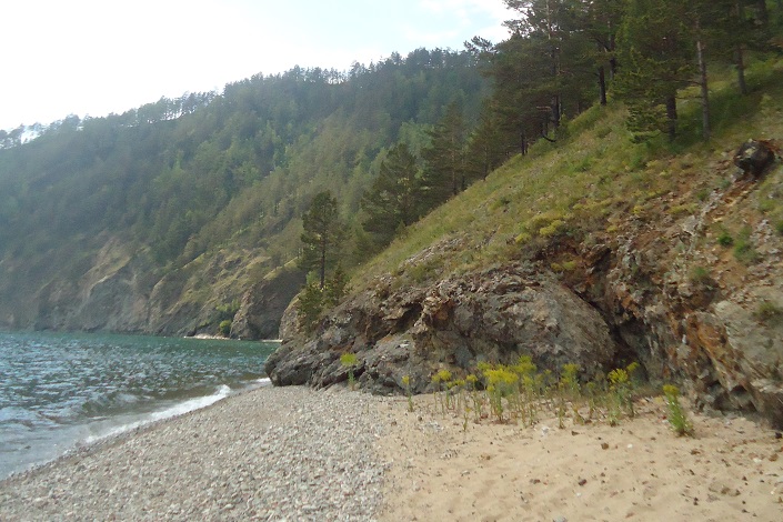 Пройдя какое-то время по лесу, к двум часам дня вышли на берег Байкала. Здесь оборудована стоянка, но мы предпочли перекусить ближе к воде, на камнях. Туристы, ходившие по ББТ, пишут о заполонившей прибрежную акваторию озера спирогире, однако нам удалось набрать байкальской водички. В любом случае нести с собой от Листвянки большое количество жидкости нет необходимости: по пути много ручьев и маленьких речек.